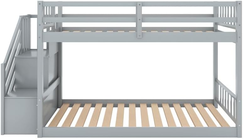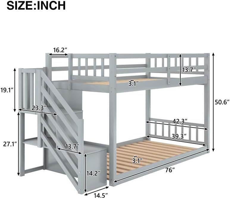 Key Features:✔ Space-Saving Low Profile DesignWith a total height of only 50.6", this bunk bed is perfect for small spaces and safe for younger users—making it a great transitional piece from nursery to a more grown-up room.✔ Sturdy Solid Wood ConstructionBuilt from durable pine wood and MDF, the bed features a stable frame with a smooth painted gray finish that complements both traditional and modern interiors.✔ Functional Storage StaircaseThe integrated side ladder doubles as a staircase with built-in storage compartments, ideal for keeping books, toys, or other essentials neatly tucked away.✔ Safety Comes FirstThe upper bunk is equipped with full-length guardrails, while the dual-side ladders offer convenient and secure access from either side.✔ No Box Spring RequiredSlatted design supports twin mattresses directly—no need for a box spring.◆ Specifications:Product Type: Twin over Twin Bunk BedMaterial: Pine Wood + MDFColor: GrayStyle: TransitionalLadder Type: Staircase with Built-in StorageGuardrails: Included (Top Bunk)Number of Packages: 2Box Spring Needed: NoAssembly Required: YesOrigin: Vietnam◆ Dimensions:Overall Dimensions: 90.5"L × 42.3"W × 50.6"HUpper/Lower Bed Size: 76"L × 39.3"W (Fits Twin Mattress)Recommended Mattress Thickness:Upper Bed: ≤ 6"Lower Bed: 8"–10"Weight Capacity (Each Bed): 200 lbsTotal Product Weight: 139 lbs◆ Package Information:Package 1: 47.83" × 28.74" × 7.09", 92.64 lbsPackage 2: 79.53" × 12.4" × 5.12", 50.71 lbs