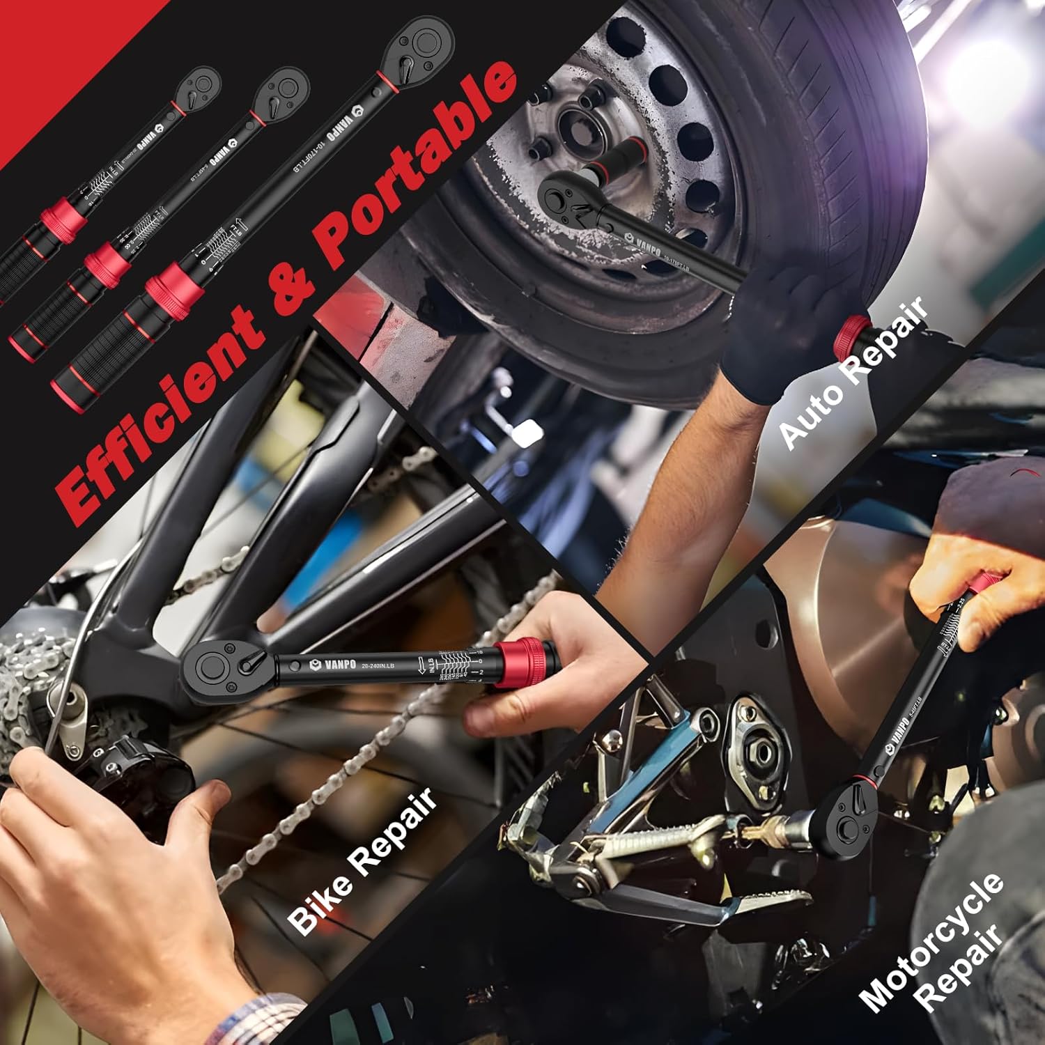 | Included Components | 1/2" Drive Torque Wrench: 10–170 ft-lb; 3/8" Drive Torque Wrench: 5–45 ft-lb; 1/4" Drive Torque Wrench: 20–240 in-lb, 1/4" Drive Accessories: Quick-Release Chuck Spring Sleeve 100mm Extension Bar, 1/4" Drive Precision Bits (S2 Steel): Hex (H): H1.5, H2, H2.5, H3, H4, H5, H6, H8, H10 Phillips (PH): PH1, PH2 Torx (T): T6, T7, T8, T9, T10, T15, T20, T25, T30, Additional 1/4" Bit Set: H2, H2.5, H3, H4, H5, H6 T10, T15, T25 PH2, Socket & Bit Accessories: 1/2" Drive Sockets: 17mm & 19mm, 21mm & 23mm 3/8" Drive Sockets: 8mm, 10mm 3/8" Spark Plug Sockets: 14mm & 16mm (Universal) 3/8" Drive Impact Bits: T25, T40 3/8" Drive Extension Bar: 250mm |